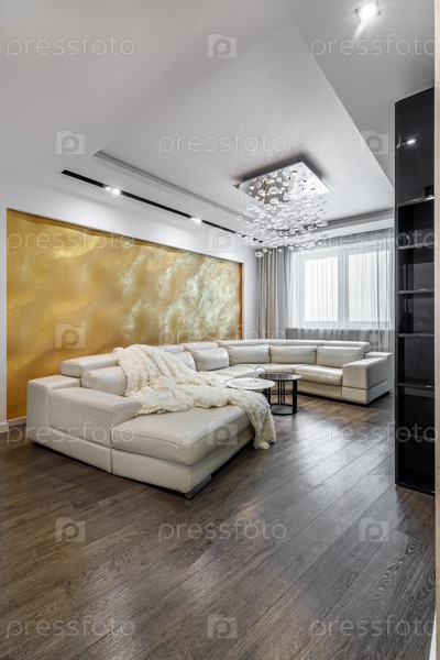 Гостиная с белыми стенами и огромным белым диваном, черный глянцевый шкаф с большой желтой 3D-панелью на стене