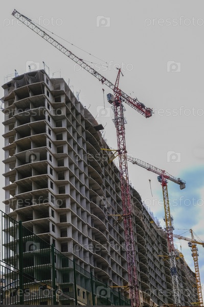 Строящийся высотный дом с несколькими строительными кранами