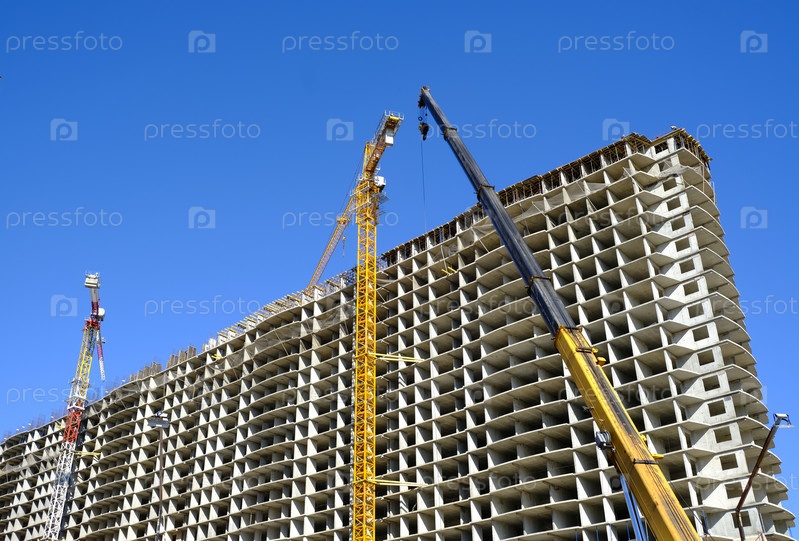 Подъемные краны желтого цвета и строящийся дом на фоне голубого неба