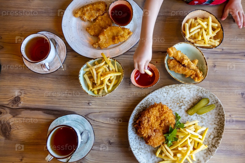 Дети и мужские руки собирают картофель фри на деревянном столе в ресторане