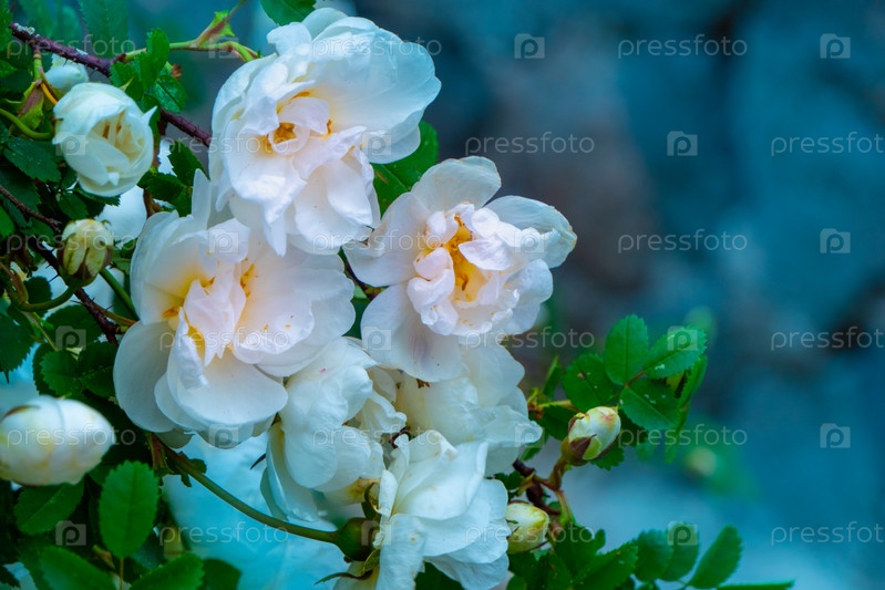 Белый цветок шиповника на темно-зеленом фоне