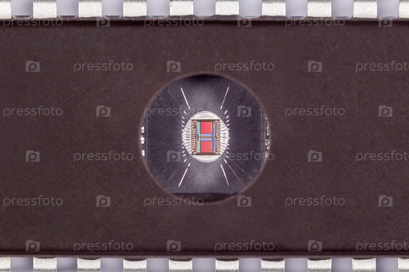 Фрагмент чипа PROM с УФ-стиранием, крупный план с кристаллом, видимый через окно