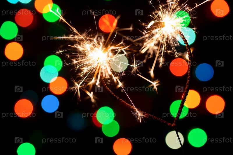 Горящий бенгальский огонь в форме сердца на фоне разноцветного боке
