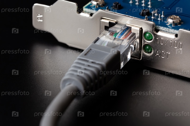Компьютерная сетевая карта с подключенным кабелем на черном фоне крупным планом
