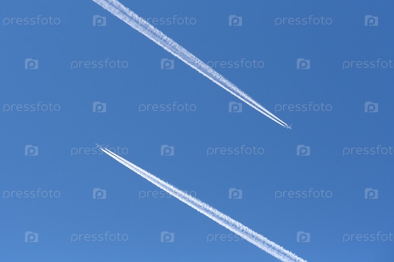 Два самолета в ясном небе оставляют паровой след на встречном курсе