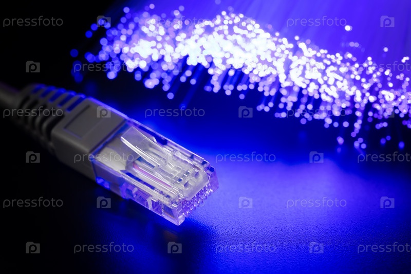 Светящийся волоконно-оптический кабель и разъем RJ-45 на темном фоне.Современные коммуникации Абстрактный высокотехнологичный фон