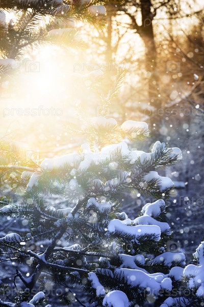 Зимний лесной пейзаж со снегом и солнцем. Двухцветная тонировка