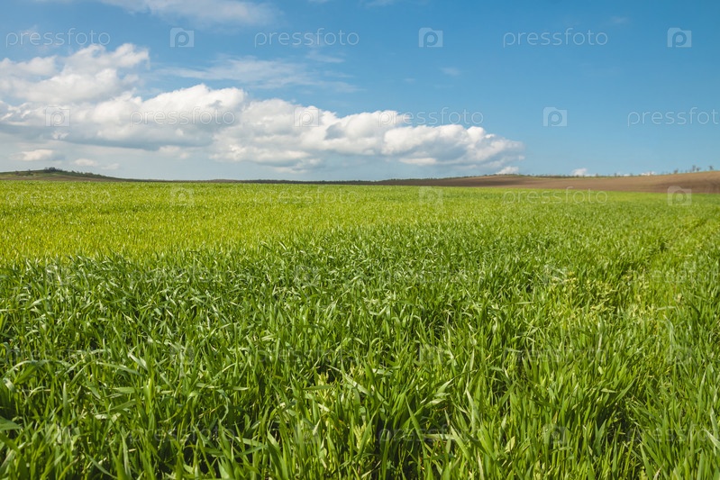 Поле молодой зеленой пшеницы на фоне голубого неба с облаками