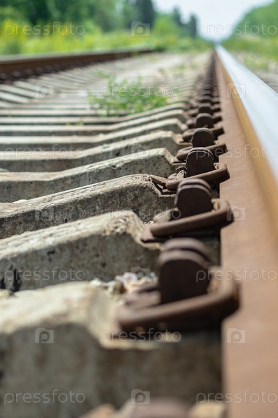Крупный план бетонных шпал и железнодорожных путей. Выборочный фокус. Концепция железной дороги