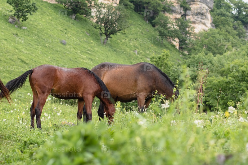 Две коричневые лошади стоят на фоне горы. Их голов не видно из-за травы. Горное пастбище. Понятие животноводства