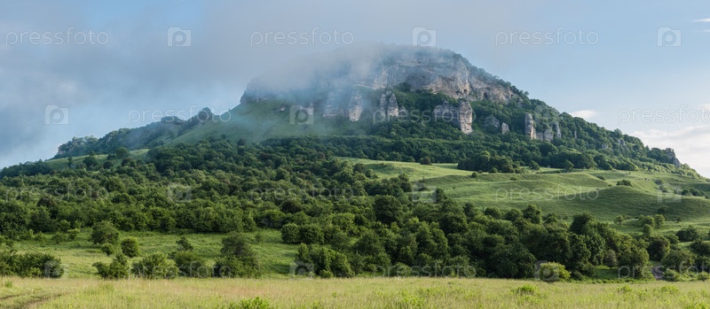 Над маленькими зелеными деревьями и холмами возвышается могучая скала. Вершина горы скрыта туманом. На заднем плане голубое небо. Панорамное фото