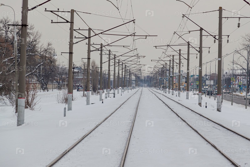 Два железнодорожных пути уходят вдаль вместе со столбами. Серый зимний городской пейзаж. Краснодар, Россия, 18 февраля 2021 г
