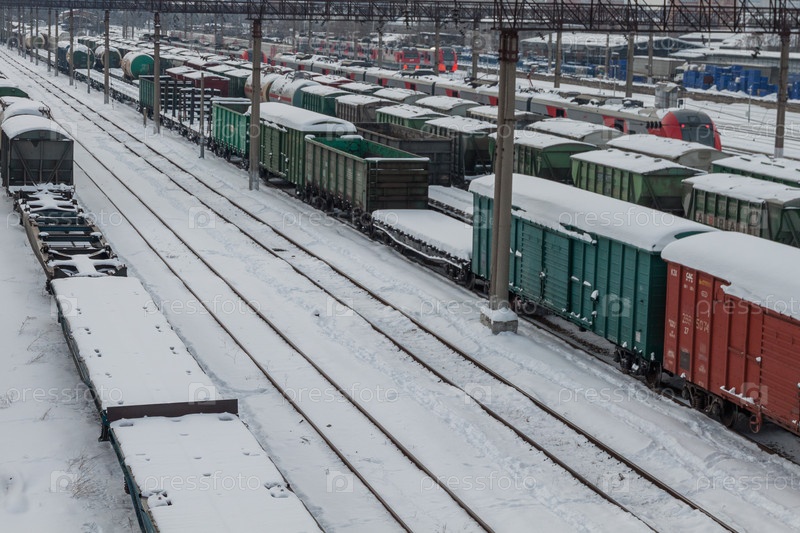 Железнодорожный вокзал засыпало снегом вместе с вагонами. Вид сверху. Понятие о железнодорожном транспорте. Краснодар, Россия, 18 февраля 2021 г