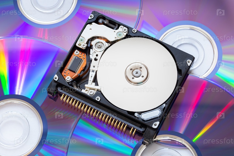 Компактный жесткий диск форм-фактора 1,8" с открытой крышкой, лежащий на стопке оптических дисков