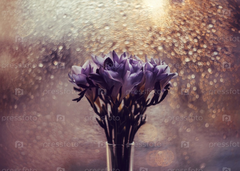 Красивый букет фрезий на фоне окна. Блестящий золотой боке. Ярко-синие фиолетовые фрезии в вазе в лучах заката. Цветочный узор. Макрос крупным планом