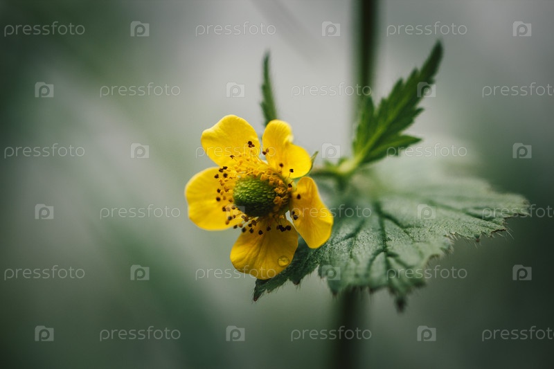 Желтый цветок на зеленом размытом фоне. Лапчатка или лапчатка. Вид сбоку, макрос крупным планом. Дикий цветок на лугу