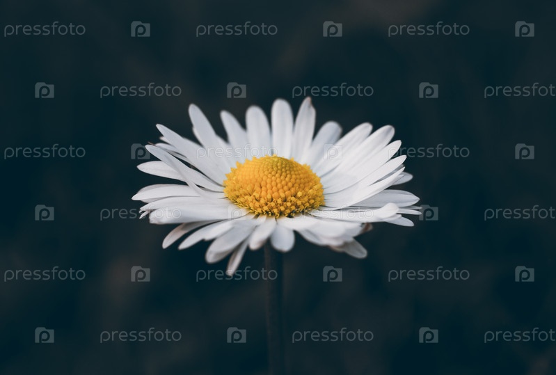 Дейзи на темно-зеленом фоне крупным планом. Маргарита с белыми лепестками и желтой серединой. Крупный план, вид сбоку. Садовое растение