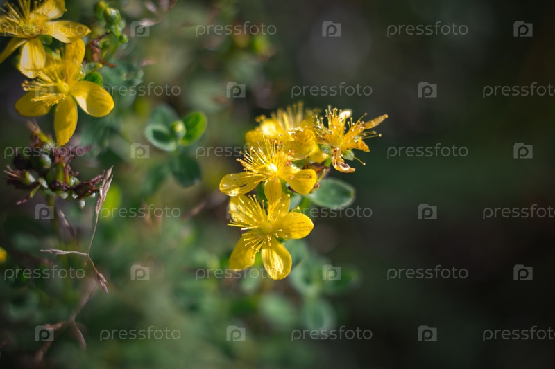 Зверобой, зверобой, ул. джон уорт на зеленом фоне крупным планом. Яркий красивый желтый цветок на лугу. Лекарственные полезные растения. Альтернативная медицина. Макро