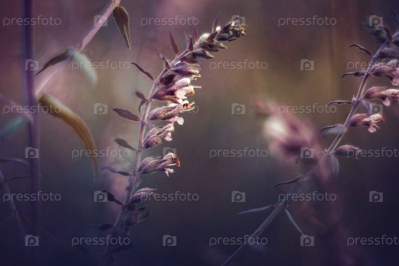 Красивое изображение полевых цветов на фиолетовом закате. Пейзаж с полевыми цветами. Закат цветочный фон. Винтажное фото