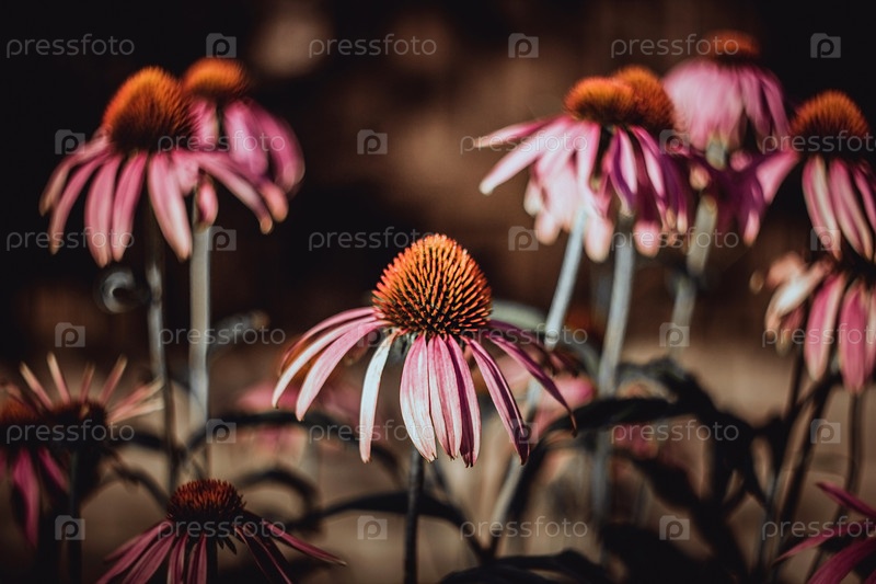 Красивые розовые цветы на зеленом фоне. Цвет сепия. Эхинацея пурпурная Магнус. Лекарственные полезные садовые растения. Альтернативная медицина