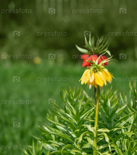 Желтый и красный цветок Fritillaria Imperialis на естественном зеленом фоне. Императорская корона, императорский рябчик в саду. Многолетнее растение