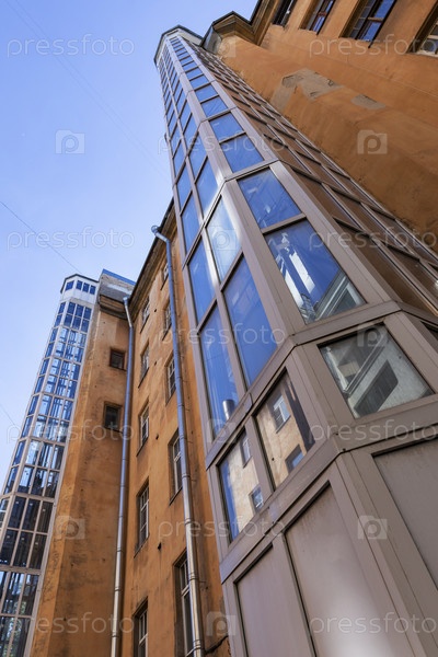Россия. Санкт-Петербург. Новое лифтовое оборудование в старом многоквартирном доме. Внешняя шахта лифта. Россия. Санкт-Петербург. Новое лифтное оборудование в старом жилом здании. External elevator shaft