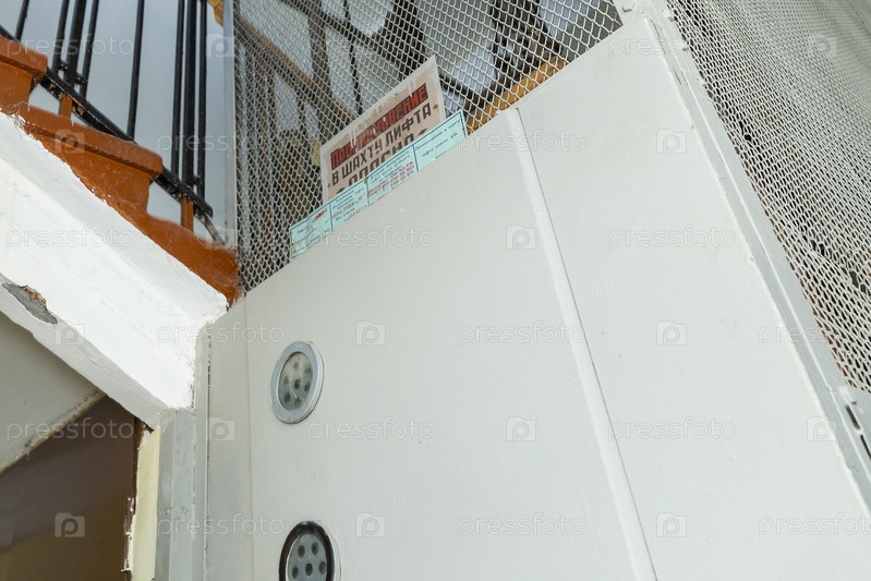 Россия. Санкт-Петербург. Старые лифтовые устройства в многоквартирном доме. Предупреждение Проникновение в шахту Лифт опасен для жизни. Россия. Санкт-Петербург. Старое оборудование лифта в жилом здании. Предупреждение Проникновение в лифт