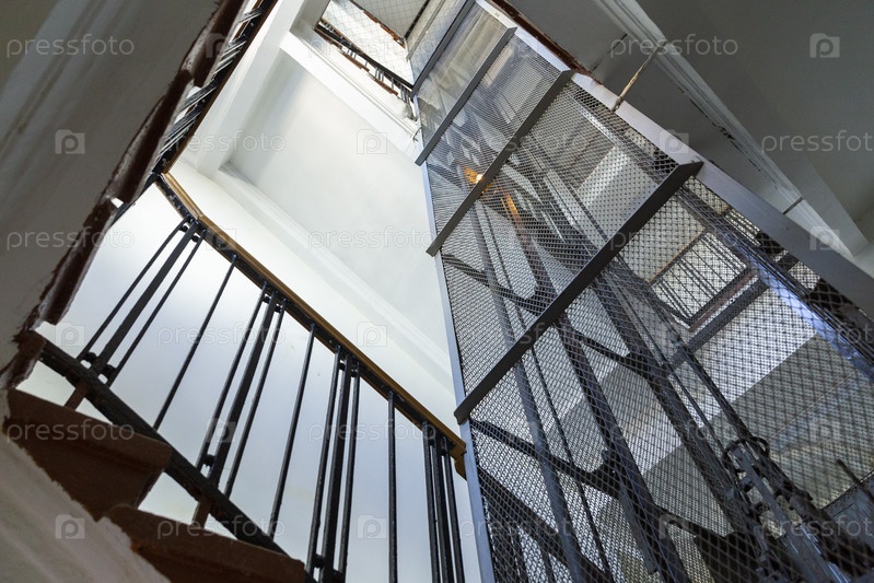 Россия. Санкт-Петербург. Старое лифтовое оборудование в многоквартирном доме. Лифтная шахта. Россия. Санкт-Петербург. Старые лифтовые устройства в жилом здании. Лифтный вал
