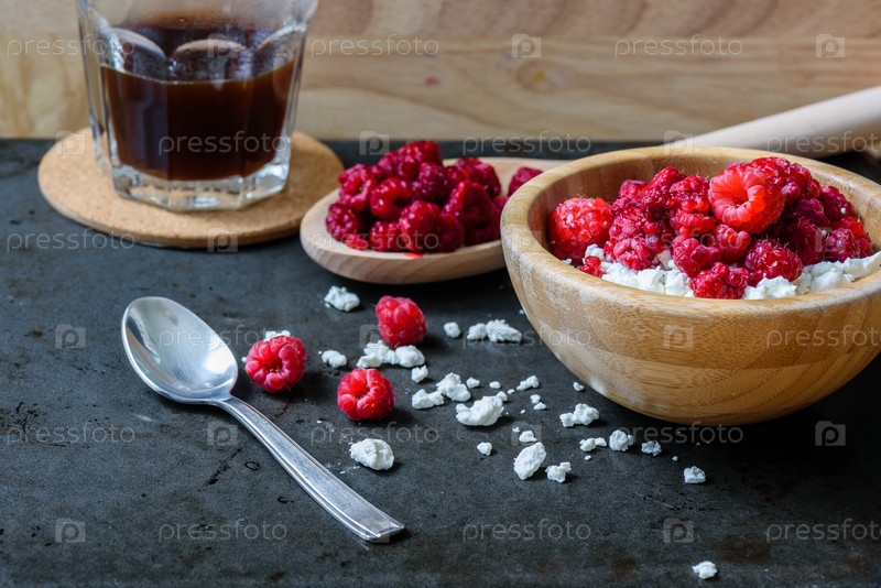 Сладкий завтрак с творогом, малиной и чашкой кофе