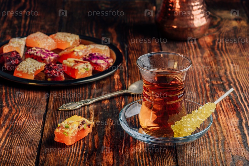 Чай в стакане армуду с рахат-лукумом