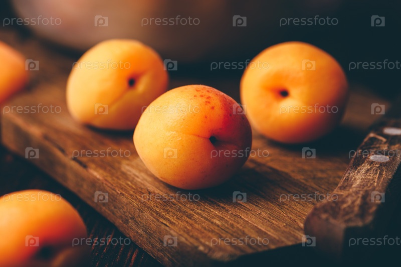 Спелые абрикосы с ножом над разделочной доской