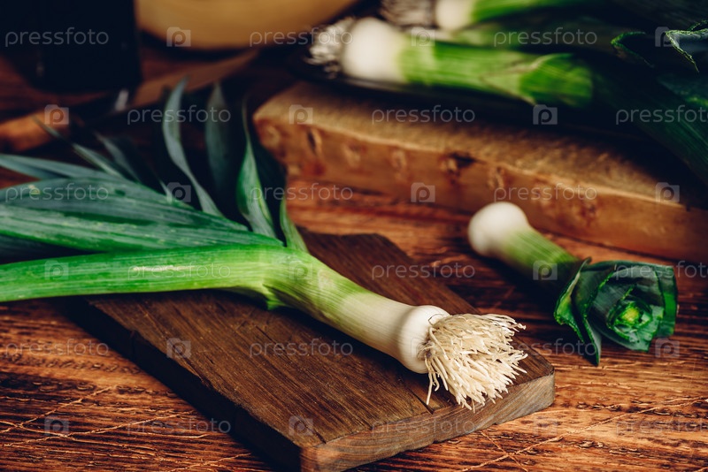 Свежий зеленый лук-порей на разделочной доске