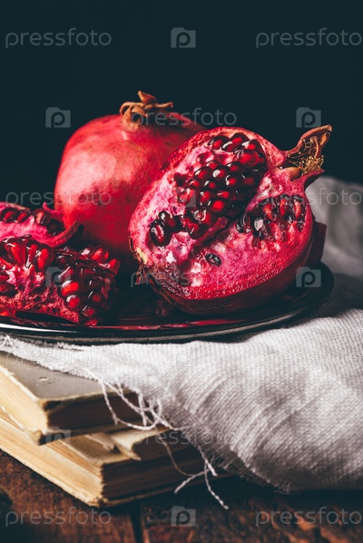 Гранат на тарелке над тканью и старыми книгами