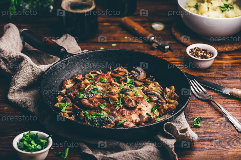 Жареный стейк из свиной шеи с разными грибами