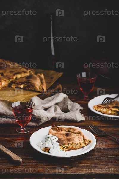 Кусочек капустного пирога со сметанным соусом