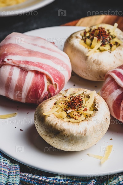 Шампиньоны в беконе, фаршированные сыром