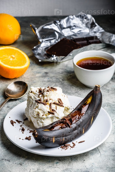 Жареный банан с темным шоколадом и ванильным мороженым