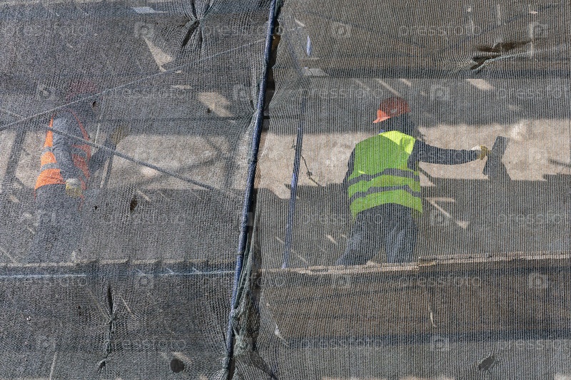 Россия. Санкт-Петербург. Сотрудники строительной компании ремонтируют фасад здания. Россия. Санкт-Петербург. Работники строительной компании ремонтят фасад здания