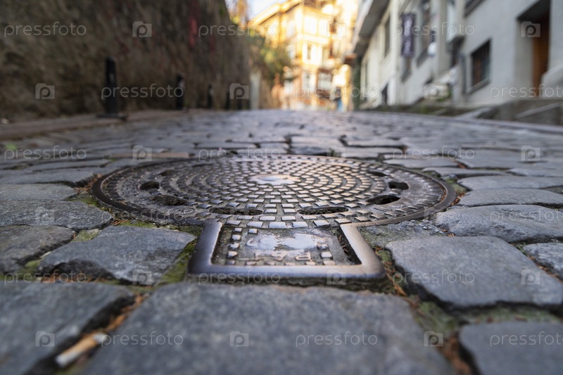 Турция. Стамбул. Канализационный люк. Крышка люка на мостовой дороге с мостами. Турция. Стамбул. Шланг канализации. Покрытие трубопровода на асфальтированной тротуаре