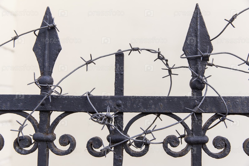 Россия. Санкт-Петербург. Ограждение. Колючая проволока на заборе. Россия. Санкт-Петербург. Забор. Прямоугольный провод на ограждении