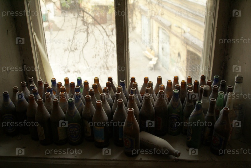 Россия.Санкт-Петербург.Группа пустых бутылок пива на подоконнике.Россия.Санкт-Петербург.Куча пустых бутылок пива на подоконнике