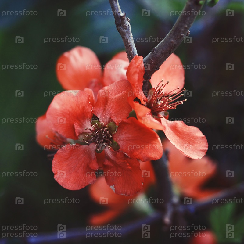 Красивые красные цветы айвы, королева-яблоко, яблочная айва на темно-зеленом фоне. Полезное декоративное плодовое дерево. Макрос крупным планом