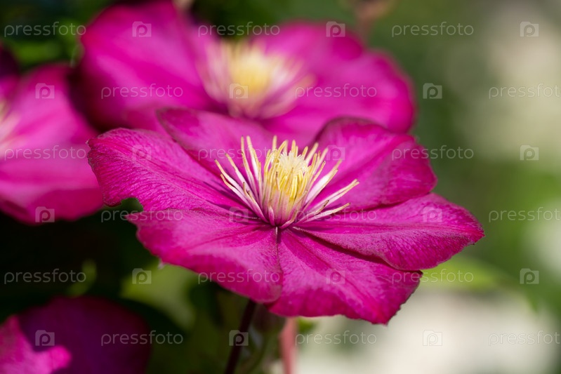 Розовый цветок клематиса на естественном зеленом фоне крупным планом. Садовые вьющиеся цветы. Летний цветочный фон