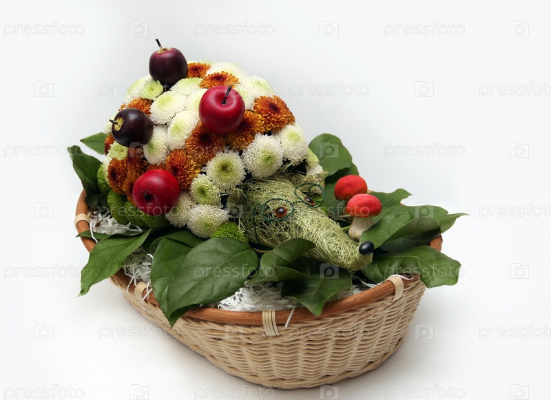 Букет цветов в виде ежика в корзине на белом фоне. Цветочная композиция. Цветочный ежик из белых и оранжевых хризантем с очками, грибами и яблоками