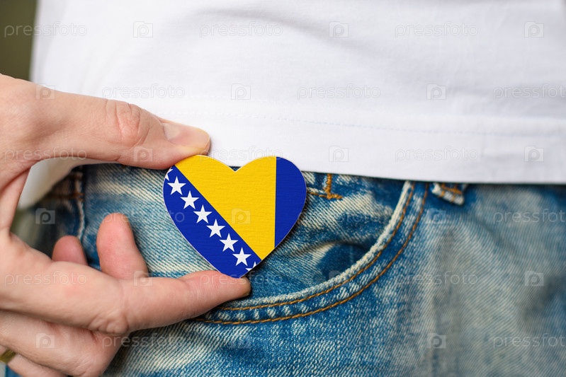Житель Боснии и Герцеговины. Деревянный значок с флагом Боснии и Герцеговины в форме сердца в мужской руке