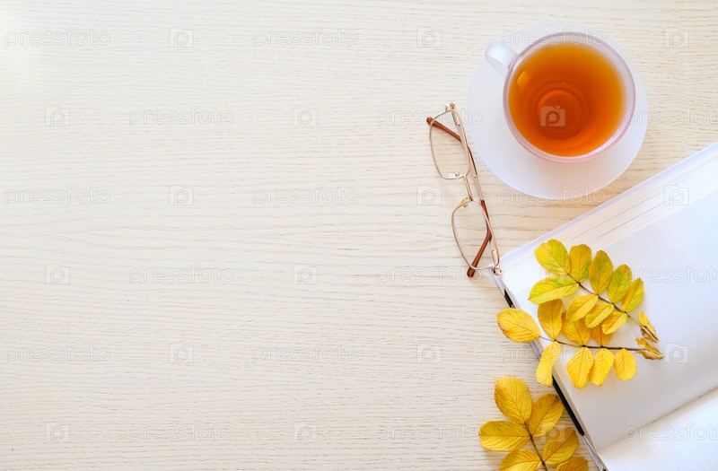 Очки для чтения, книга и чай на белом деревянном столе. Плоская укладка. Слева пустое место для рекламы или текста. Концепция осеннего утра. Выборочная фокусировка на очках