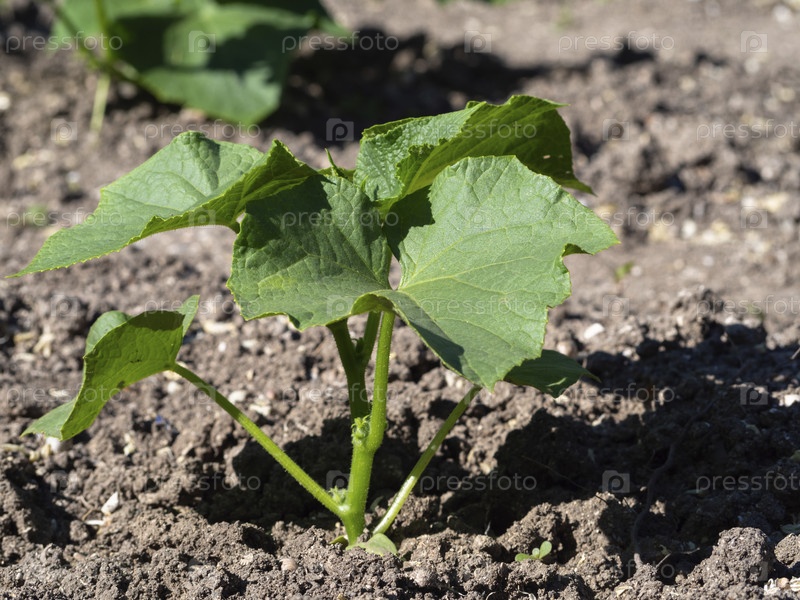 Молодой огурец с несколькими листьями в почве, крупный план. Выращивание органических овощей. Зеленый огуречный куст весной в открытом грунте