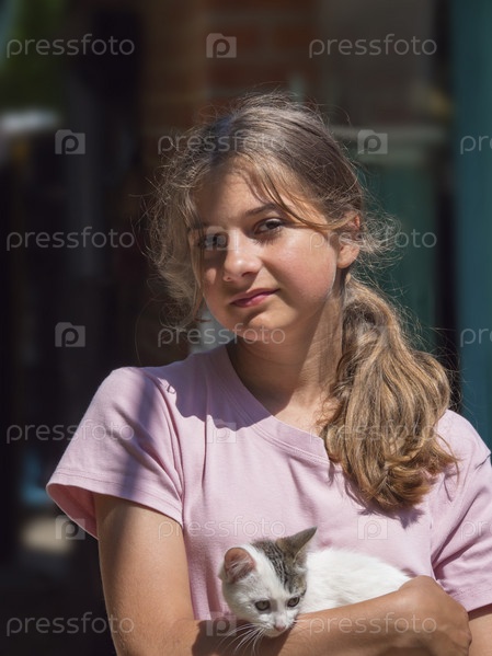 Портрет красивой девушки с котенком на руках. Милая девочка-подросток смотрит в камеру и обнимает милого маленького котенка. Молодая улыбающаяся кавказская девушка на улице обнимает милую кошку