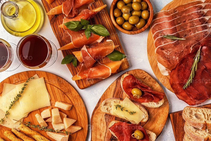 Фон итальянской кухни с ветчиной, сыром, оливками