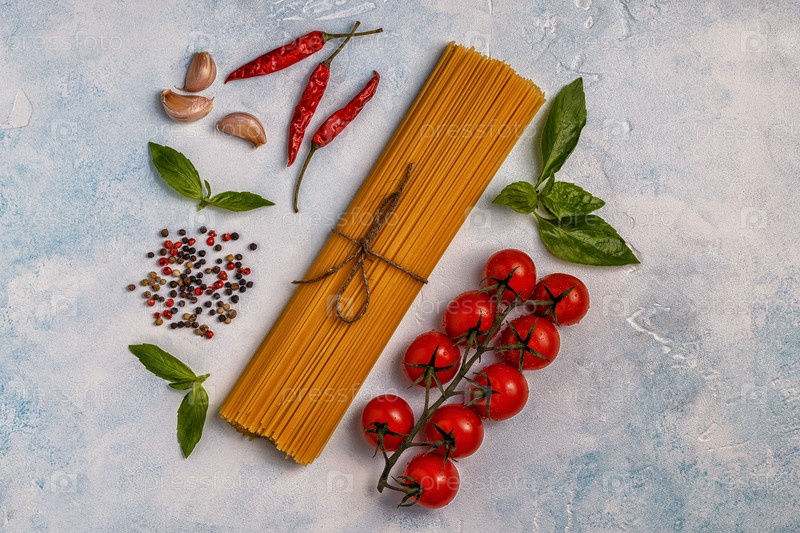Фон итальянской кухни с макаронами, специями и овощами